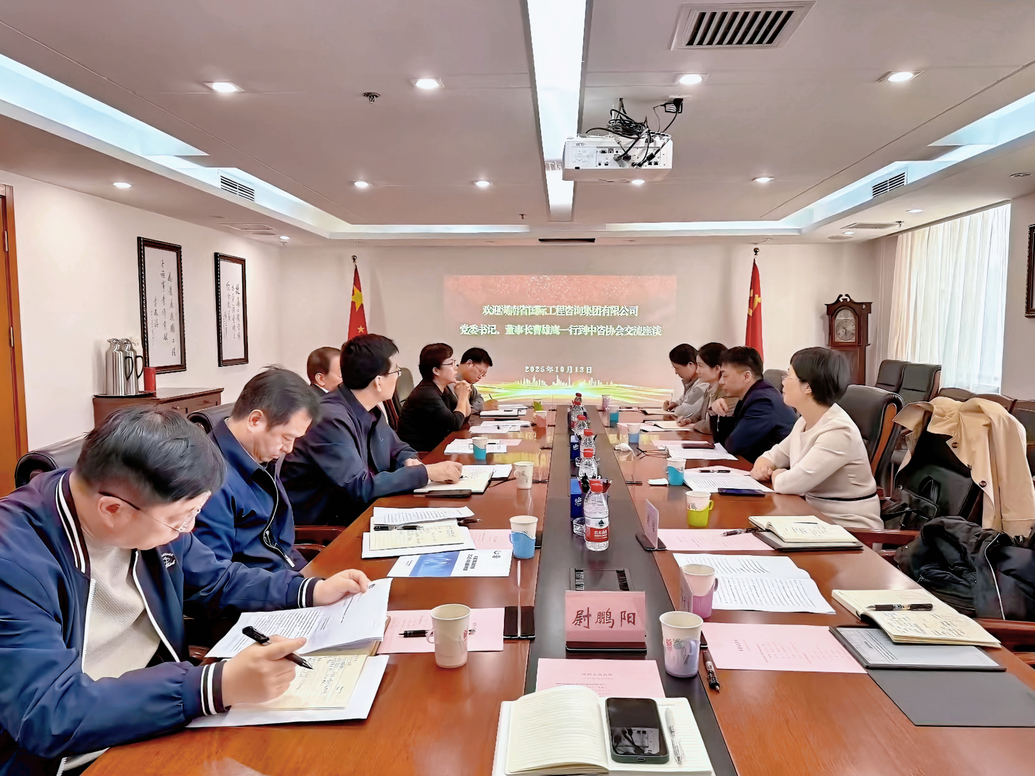 10月13日,集團(tuán)黨委書(shū)記、董事長(zhǎng)曹雄鷹率隊(duì)赴中國(guó)工程咨詢(xún)協(xié)會(huì)學(xué)習(xí)交流,協(xié)會(huì)會(huì)長(zhǎng)肖鳳桐熱情接待并座談。